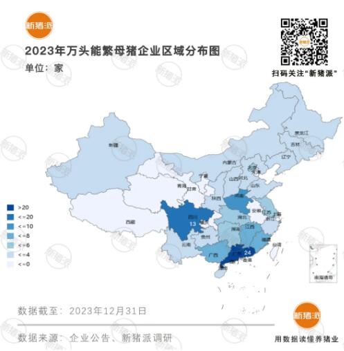 根據(jù)新豬派調(diào)研,萬頭豬企主要集中在廣東、四川、廣西、福建、江西等南方。養(yǎng)豬規(guī)模化程度高的廣東有著數(shù)量最多的萬頭豬企,多達24家。山東變化最大,不僅承受著豬價低迷帶來的資金周轉(zhuǎn)壓力,還要在秋冬季里飽受非瘟病毒的侵襲,被迫快速減欄母豬,萬頭豬企數(shù)量從2022年的6家減少至2023年的2家。