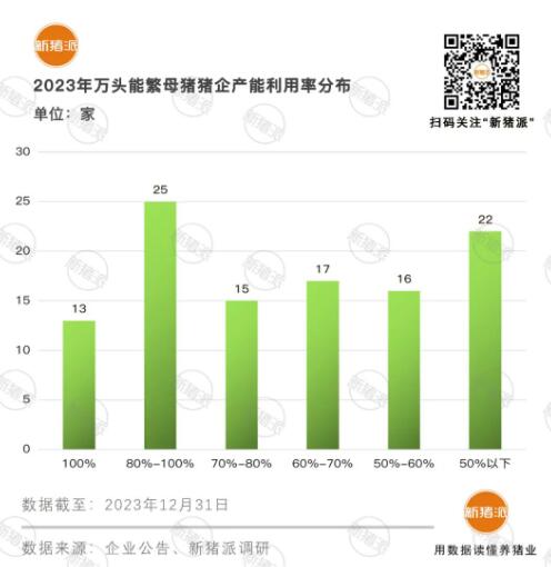 眾所周知,產(chǎn)能利用率低直接推高企業(yè)養(yǎng)殖成本,大量閑置資產(chǎn)除了資金占有費高外,生產(chǎn)設(shè)備的運維費用隨之升高。據(jù)新豬派統(tǒng)計,截至2023年底,118家萬頭豬企能繁母豬產(chǎn)能利用率平均值為67%。產(chǎn)能利用率超過80%的豬企為38家約占32%,主要為能繁母豬在5萬頭以下的豬企。