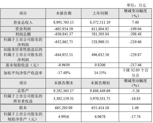 1、報告期經(jīng)營情況報告期內(nèi),公司實現(xiàn)營業(yè)總收入為899.18億元,利潤總額-63.08億元,歸屬于上市公司股東的凈利潤為-63.29億元。公司歸屬于上市公司股東的凈利潤同比下降219.66%,主要原因是: