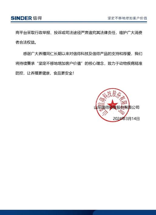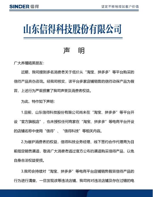 針對近日網(wǎng)上多家店鋪假冒公司名義銷售動保產(chǎn)品一事,3月14日,信得科技發(fā)布聲明,目前,公司尚未在“淘寶、拼多多”等平臺開設(shè)“官方旗艦店”,也未授權(quán)任何商家在上述平臺開設(shè)的店鋪名稱中使用“信得”、“信得科技”等相關(guān)內(nèi)容,請廣大消費(fèi)者認(rèn)準(zhǔn)公司指定銷售渠道。