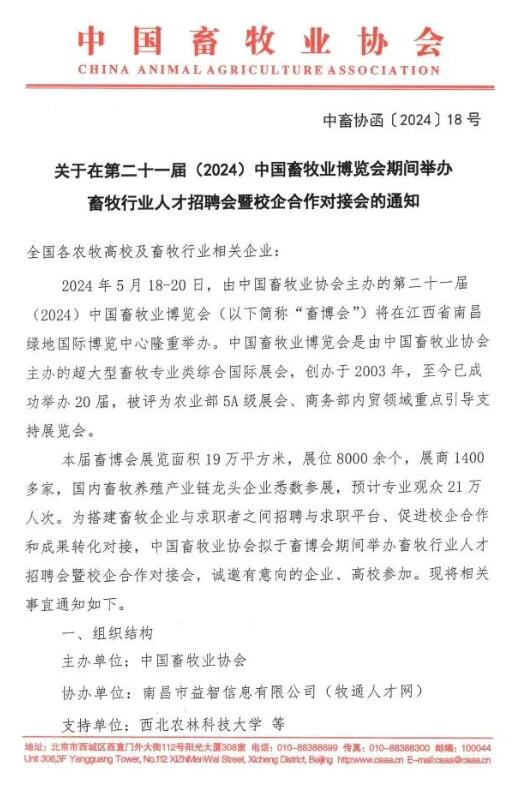 由中國畜牧業(yè)協(xié)會(huì)主辦、牧通人才網(wǎng)協(xié)辦的畜牧行業(yè)人才招聘會(huì)暨校企合作對(duì)接會(huì)將于5月18-20日在南昌綠地國際博覽中心隆重舉辦,誠邀有意向的企業(yè)、高校參加。
