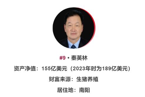 牧原秦英林以155億美元資產(chǎn)入選中國富豪第9位。作為世界上最富有的肉類行業(yè)企業(yè)家之一,秦英林的財富雖然從一年前的189億美元縮水至155億美元,但仍躋身中國內(nèi)地前十。由于豬肉價格下跌和疫情結(jié)束的影響,秦英林的牧源食品在2023年出現(xiàn)了虧損,導致公司股價下滑。