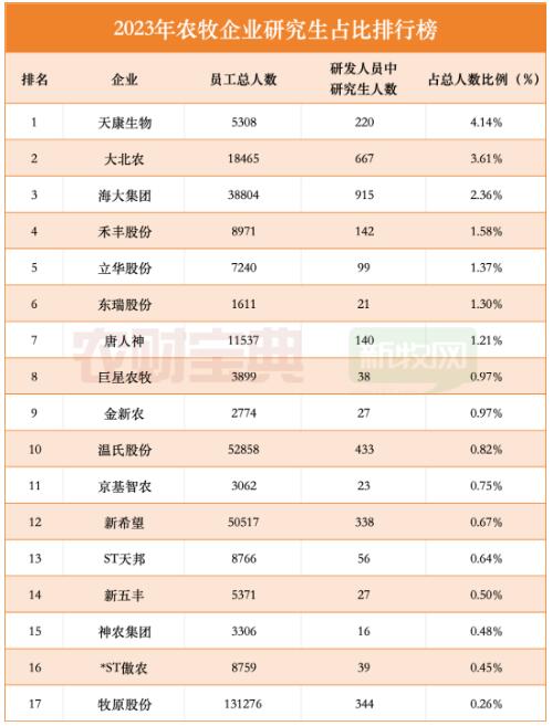 從研發(fā)強度來看,大北農居首位,其研發(fā)金額占總營收比例的2.5%;其次是東瑞股份(占比2.31%)、牧原股份(占比1.5%)。從人才結構來看,天康生物更勝一籌,其研究生人數占公司總人數4.14%,其次是大北農、海大集團。