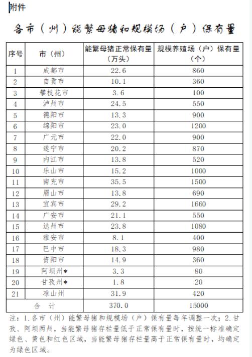 按照農(nóng)業(yè)農(nóng)村部《生豬產(chǎn)能調(diào)控實(shí)施方案(2024年修訂)》要求,結(jié)合《四川省“十四五”推進(jìn)農(nóng)業(yè)農(nóng)村現(xiàn)代化規(guī)劃》,設(shè)定四川省能繁母豬存欄量調(diào)控目標(biāo)穩(wěn)定在正常保有量370萬頭左右。結(jié)合各市(州)產(chǎn)業(yè)發(fā)展布局重點(diǎn),確定能繁母豬正常保有量(附件1)。各市(州)能繁母豬月度存欄量以國家統(tǒng)計局季度數(shù)據(jù)為基數(shù),根據(jù)農(nóng)業(yè)農(nóng)村部養(yǎng)殖場直聯(lián)直報系統(tǒng)監(jiān)測數(shù)據(jù)測算得出。(農(nóng)業(yè)農(nóng)村廳負(fù)責(zé))
