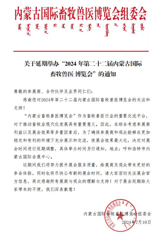 關(guān)于延期舉辦“2024 年第二十二屆內(nèi)蒙古國際