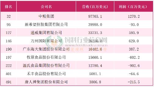 在農(nóng)牧行業(yè)里,共有9家企業(yè)上榜,中糧集團(tuán)以97765.1百萬美元的營收位于第32位,新希望控股集團(tuán)有限公司以39988百萬美元的營收位于第95位,通威集團(tuán)有限公司以33731.3百萬美元的營收位于第127位;萬州國際有限公司、廣東海大集團(tuán)股份有限公司、牧原食品股份有限公司、溫氏食品集團(tuán)股份有限公司、禾豐食品股份有限公司、唐人神集團(tuán)股份有限公司紛紛上榜。