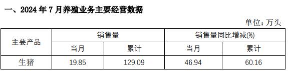 2024年1-7月,公司共銷售生豬129.09萬頭(其中商品豬119.33萬頭),銷售收入23.50億元。其中向集團(tuán)內(nèi)部屠宰企業(yè)銷售生豬19.55萬頭。