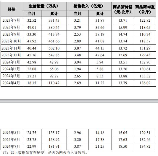 2024年1-7月,公司累計(jì)銷售生豬181.91萬(wàn)頭,同比下降45.11%;累計(jì)銷售收入21.25億元,同比下降33.32%。