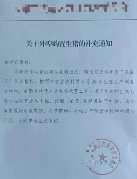北方某地發(fā)布了一個通知,表示根據市農業(yè)農村委會議精神,鼓勵養(yǎng)殖戶從外埠購買肥豬進行二次育肥,每頭豬補貼150元!