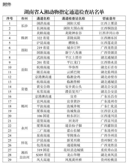 據(jù)了解,早在2020年,為維護(hù)生豬及生豬產(chǎn)品流通秩序,湖南印發(fā)了《關(guān)于入湘生豬及生豬產(chǎn)品實(shí)施指定通道管理的通告》,并設(shè)立29個(gè)通道,為防范生豬疫病、打擊違法違規(guī)調(diào)運(yùn)行為,發(fā)揮了重要作用。2021年,為加強(qiáng)動(dòng)物防疫,國(guó)家新修訂實(shí)施了《中華人民共和國(guó)動(dòng)物防疫法》,將監(jiān)督檢查范圍從生豬擴(kuò)大到所有通過(guò)道路運(yùn)輸、跨省調(diào)入的動(dòng)物?!锻ǜ妗纷?024年10月1日起實(shí)施,有效期5年。2020年9月5日由湖南省農(nóng)業(yè)農(nóng)村廳、省公安廳、省交通運(yùn)輸廳、省市場(chǎng)監(jiān)督管理局和省高速公路集團(tuán)有限公司聯(lián)合印發(fā)的《關(guān)于入湘生豬及生豬產(chǎn)品實(shí)施指定通道管理的通告》(湘農(nóng)聯(lián)〔2020〕97號(hào))同時(shí)廢止。湖南省設(shè)立29個(gè)入湘動(dòng)物指定通道名單如下: