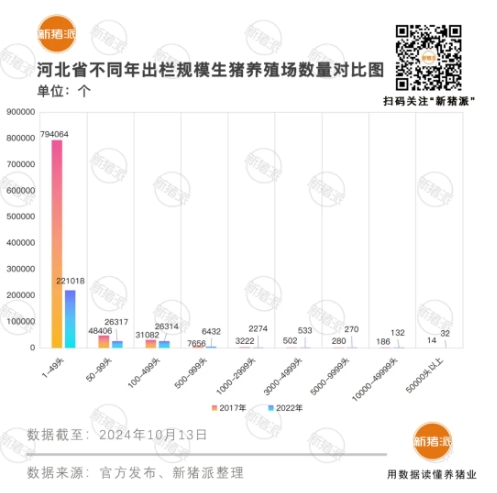 將2022年與2017年進行比較,河北9個出欄等級的豬場中,除3000-4999、50000頭以上的豬場數(shù)量有少量增加外,其余7個等級的豬場數(shù)量均明顯減少。反觀在廣東、廣西、湖南等南方省份,年出欄3000頭以上的豬場數(shù)量至少增加了20%。