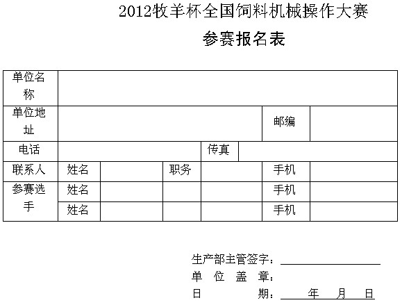 所有飼料加工企業(yè)一線操作人員均可報(bào)名,每個(gè)企業(yè)(集團(tuán))內(nèi)部先行選拔后提交《參賽申請表》,限額一隊(duì),每隊(duì)2人。大賽組委會(huì)將根據(jù)報(bào)名先后順序,經(jīng)有關(guān)專家的論證后,確定正式參賽人員名單,發(fā)放正式《參賽確認(rèn)函》。