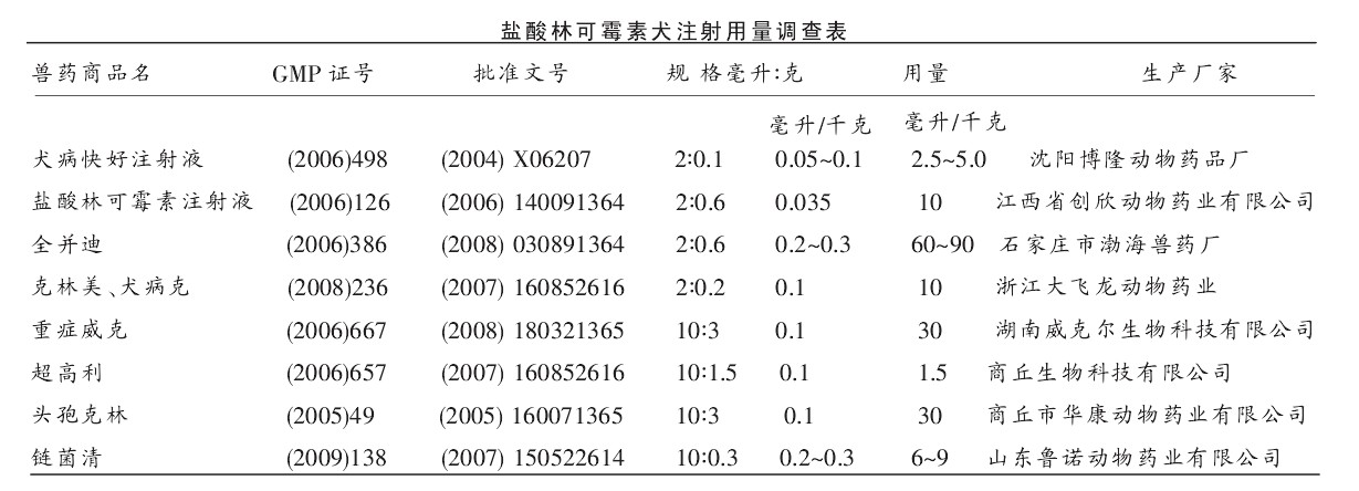 筆者在保定市清苑縣城獸藥經(jīng)營(yíng)單位和獸醫(yī)診所,對(duì)鹽酸林可霉素犬注射用量進(jìn)行了調(diào)查。 經(jīng)查8 家生產(chǎn)企業(yè)不同商品名稱的獸藥, 通用名為鹽酸林可霉素注射液,主要成分都是鹽酸林可霉素。